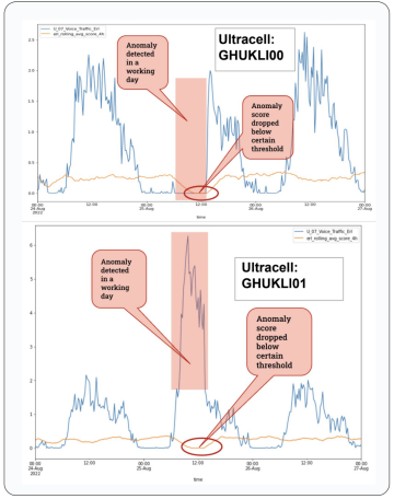 This is a textbook anomaly and the yellow line shows just that. The First base station has reached anomaly score values close to 0. Consequently, the second base station is detected doing the work of two at once, transmitting twice the amount of calls than the norm would be, and therefore reaching the mid-way mark between the usual Anomaly score and zero.