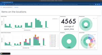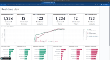 Below are example charts of real-time dashboards showing the total number of items processed in real-time. It also monitors individual employee performance, the “most-sold” goods of the day and the “most-frequented” locations in the warehouse. The warehouse manager can see all product traffic in real-time and react immediately to productivity issues—from potentially major disruptions to even minor problems. The dashboard provides the manager with actual information, much like a speedometer in your car.