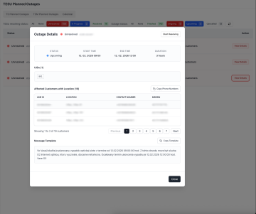 Each outage is presented with all relevant details. Operators can quickly see which customers are affected and what messages are prepared. They can copy the list of phone numbers and send SMS messages without further formatting. It’s fast, reliable, and easy to use.